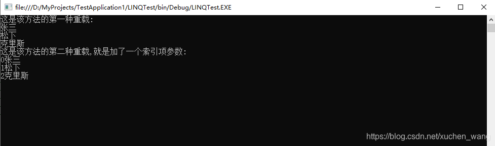 {List<Person> PersonLists = new List<Person>(){new Person { Name = "张三",Age = 20,Gender = "男",Phones = new List<Phone> {new Phone { Country = "中国", City = "北京", Name = "小米" },new Phone { Country = "中国",City = "北京",Name = "华为"},new Phone { Country = "中国",City = "北京",Name = "联想"},new Phone { Country = "中国",City = "台北",Name = "魅族"},}},new Person { Name = "松下",Age = 30,Gender = "男",Phones = new List<Phone> {new Phone { Country = "日本",City = "东京",Name = "索尼"},new Phone { Country = "日本",City = "大阪",Name = "夏普"},new Phone { Country = "日本",City = "东京",Name = "松下"},}},new Person { Name = "克里斯",Age = 40,Gender = "男",Phones = new List<Phone> {new Phone { Country = "美国",City = "加州",Name = "苹果"},new Phone { Country = "美国",City = "华盛顿",Name = "三星"},new Phone { Country = "美国",City = "华盛顿",Name = "HTC"}}}};Console.WriteLine("这是该方法的第一种重载:");var firstLists = PersonLists.Select(p => p.Name);foreach (var List in firstLists){Console.WriteLine($"{List}");}Console.WriteLine("这是该方法的第二种重载,就是加了一个索引项参数:");var secondLists = PersonLists.Select((p, q) =>{return (q.ToString() + p.Name);});foreach (var List in secondLists){Console.WriteLine($"{List}");}Console.Read();