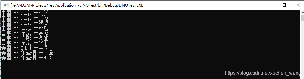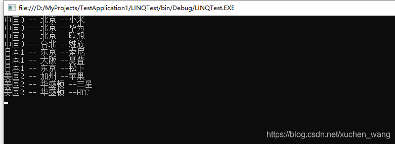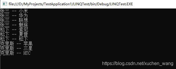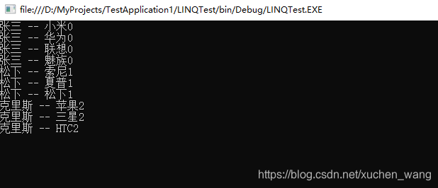 {List<Person> PersonLists = new List<Person>(){new Person { Name = "张三",Age = 20,Gender = "男",Phones = new List<Phone> {new Phone { Country = "中国", City = "北京", Name = "小米" },new Phone { Country = "中国",City = "北京",Name = "华为"},new Phone { Country = "中国",City = "北京",Name = "联想"},new Phone { Country = "中国",City = "台北",Name = "魅族"},}},new Person { Name = "松下",Age = 30,Gender = "男",Phones = new List<Phone> {new Phone { Country = "日本",City = "东京",Name = "索尼"},new Phone { Country = "日本",City = "大阪",Name = "夏普"},new Phone { Country = "日本",City = "东京",Name = "松下"},}},new Person { Name = "克里斯",Age = 40,Gender = "男",Phones = new List<Phone> {new Phone { Country = "美国",City = "加州",Name = "苹果"},new Phone { Country = "美国",City = "华盛顿",Name = "三星"},new Phone { Country = "美国",City = "华盛顿",Name = "HTC"}}}};var Lists = PersonLists.SelectMany(p => p.Phones);//此方法的第一个重载foreach (var list in Lists){Console.WriteLine($"{list.Country} -- {list.City} --{list.Name}");}Console.Read();