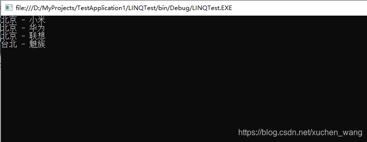 static void Main(string[] args){ List<Phone> PhoneLists = new List<Phone>(){new Phone { Country = "中国", City = "北京", Name = "小米" },new Phone { Country = "中国",City = "北京",Name = "华为"},new Phone { Country = "中国",City = "北京",Name = "联想"},new Phone { Country = "中国",City = "台北",Name = "魅族"},new Phone { Country = "日本",City = "东京",Name = "索尼"},new Phone { Country = "日本",City = "大阪",Name = "夏普"},new Phone { Country = "日本",City = "东京",Name = "松下"},new Phone { Country = "美国",City = "加州",Name = "苹果"},new Phone { Country = "美国",City = "华盛顿",Name = "三星"},new Phone { Country = "美国",City = "华盛顿",Name = "HTC"}};var Lists = PhoneLists.Select(p => new GetMyPhone().MyPhone(p));var myLists = Lists.OfType<MyPhone>();foreach (var list in myLists){Console.WriteLine($"{list.MyCity} - {list.MyName}");}Console.Read();}public class Phone{public string Country { get; set; }public string City { get; set; }public string Name { get; set; }}public class MyPhone{public string MyCity { get; set; }public string MyName { get; set; }}public class GetMyPhone{public object MyPhone(Phone phone){if (phone.Country.Equals("中国")){MyPhone myphone = new Program.MyPhone(){MyCity = phone.City,MyName = phone.Name};return myphone;}else{return phone;}}}