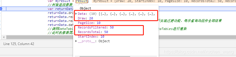 3、返回给Datatable中的字段如JS代码中展示的即可,必须要有这几个字段,不能有大小写错误。如下图所示: