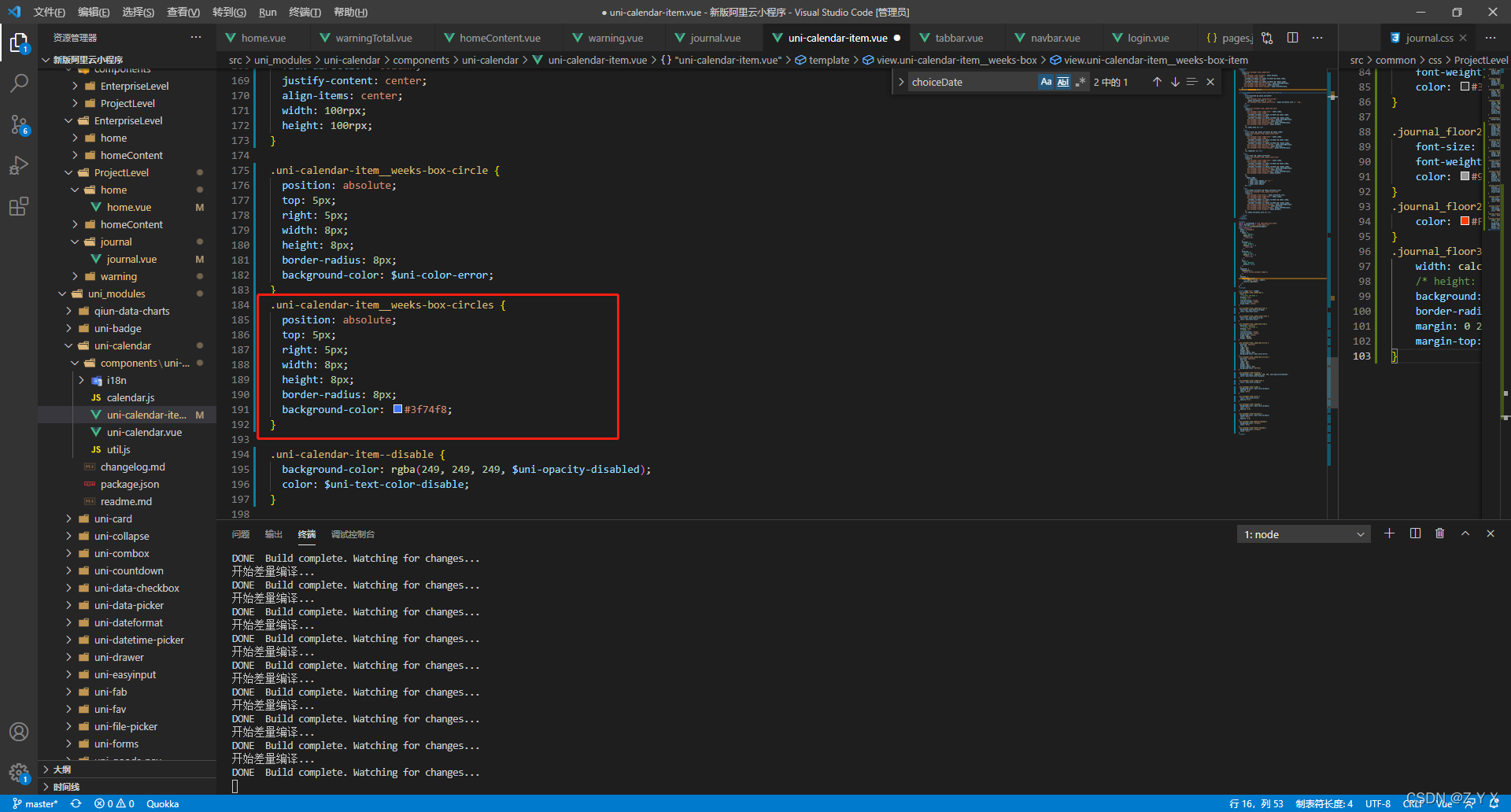 2.我们打开调试,可以看到红色打点的样式是.uni-calendar-item__weeks-box-circle