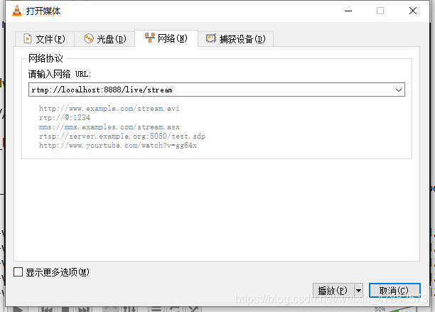 点击媒体,点击打开网络串流,输入命令转码的哪个地址,点击播放