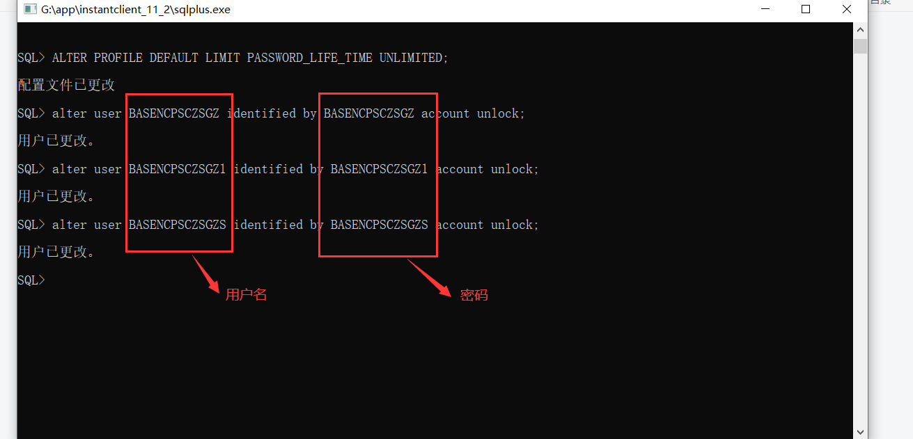 4、输入alter user 用户名 identified by <原来的密码> account unlock;解锁原密码,如下图: