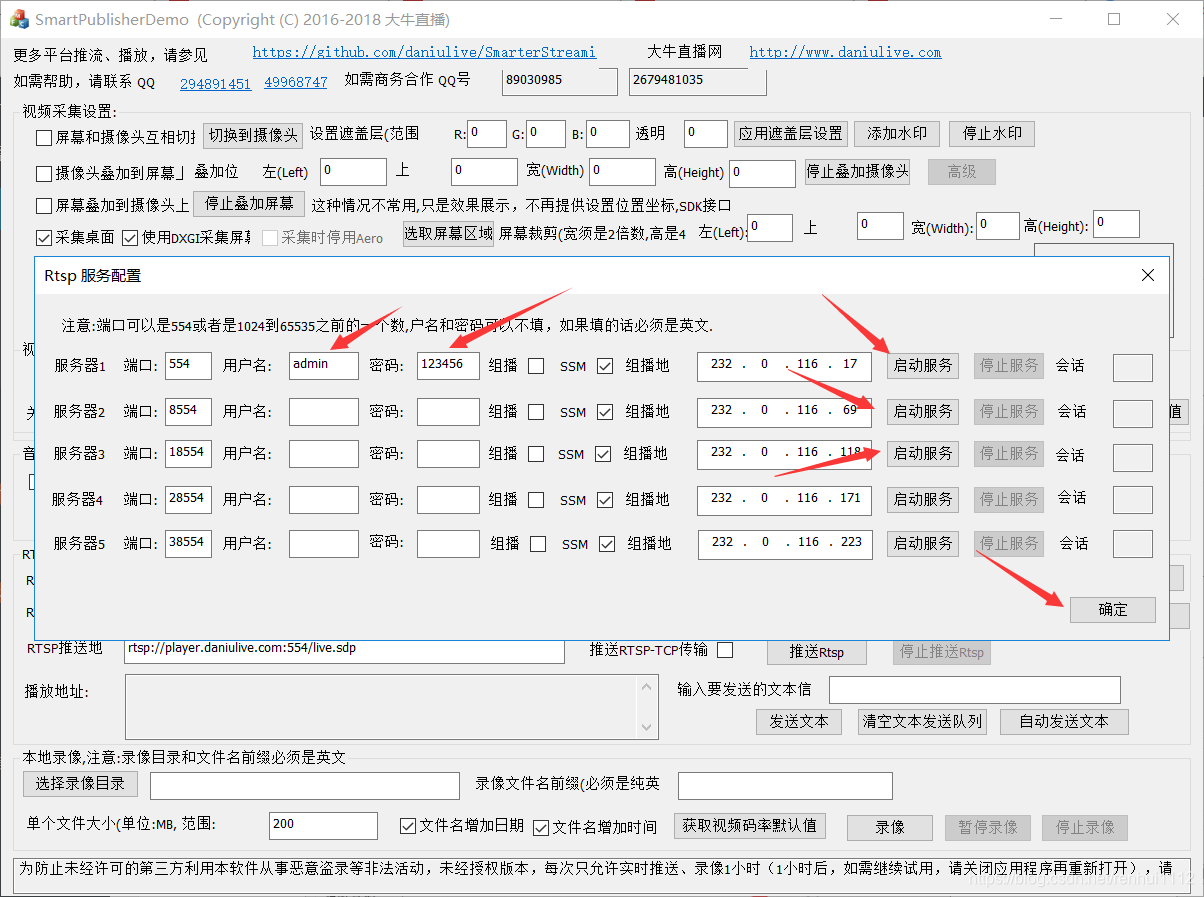2. 根据需求,可以启动一路或者多路服务,每路服务,并可配置用户名密码信息(可选)。启动服务后,点击“确定”退出设置页面;