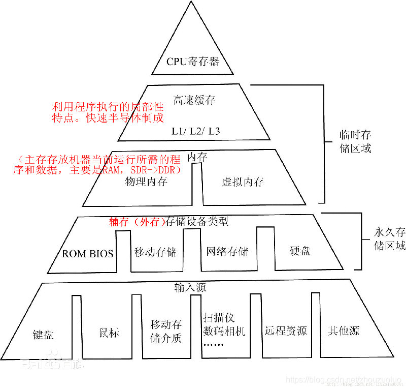 从上往下依次是CPU、高速缓存、主存、外存,可以分为4层结构;存储系统中使用高速缓存Cache 可以显著的提高计算机系统的工作速度,但是它并不是功能上必须的部件;