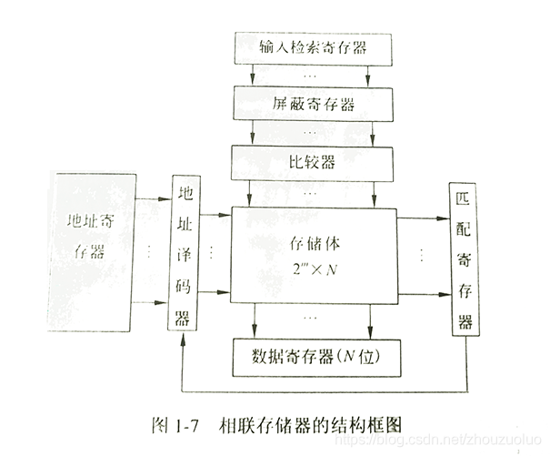 相联存储器结构如下图,为提高比较速度,其中比较器数量应很大,进行位比较时应每位对应一个比较器,所以有2的m次方*N位个,对于字比较应该有2的m次方个;匹配寄存器用来存储比较结果,1为相等,0为不等;