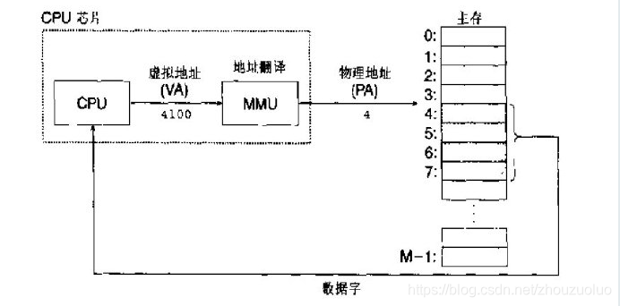现代系统提供了一种对主存的抽象,称为虚拟存储,使用虚拟地址的概念来访问主存。CPU在寻址的时候,是按照虚拟地址来寻址,然后通过MMU(内存管理单元)将虚拟地址转换为物理地址后访问主存;。