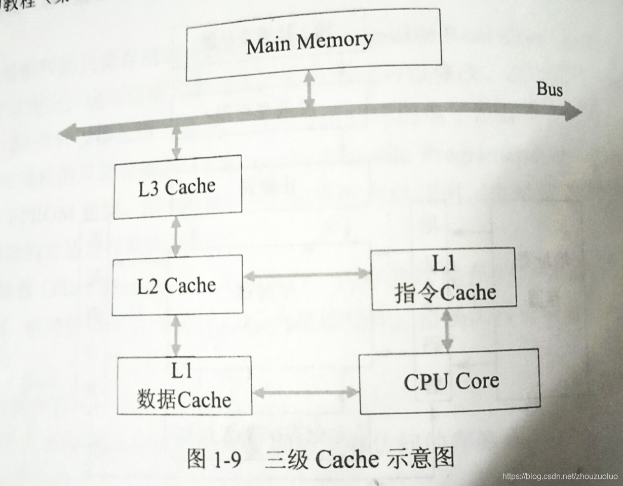 CPU询问的信息在Cache中则为命中,命中则直接对Cache存储器寻址;多级Cache如下,cpu先查找L1的cache,通常L1容量小速度快