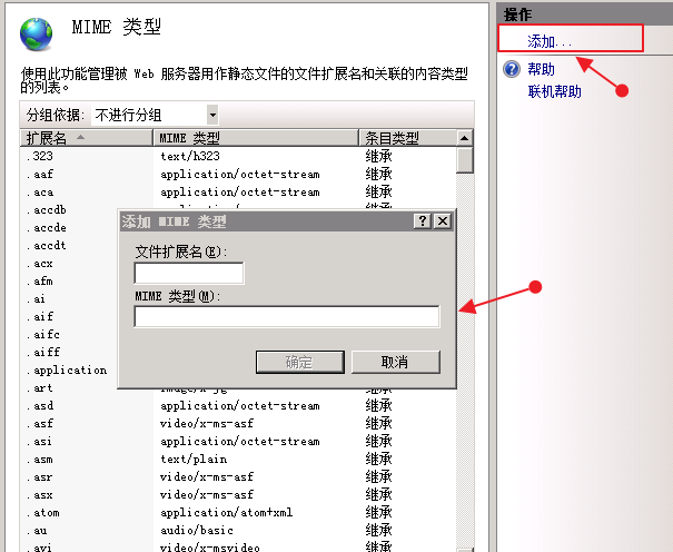 “开始” > “控制面板” > “管理工具” >“Internet 信息服务(IIS管理器)”,找到您的网站,点击网站 > 右侧找到 MIME类型> 双击“MIME类型” > 进入类型页面,点击右侧 “添加” > 如在“扩展名”框内输入“.mp4”,“MIME类型”框中输入“video/mp4”,然后确定即可。
