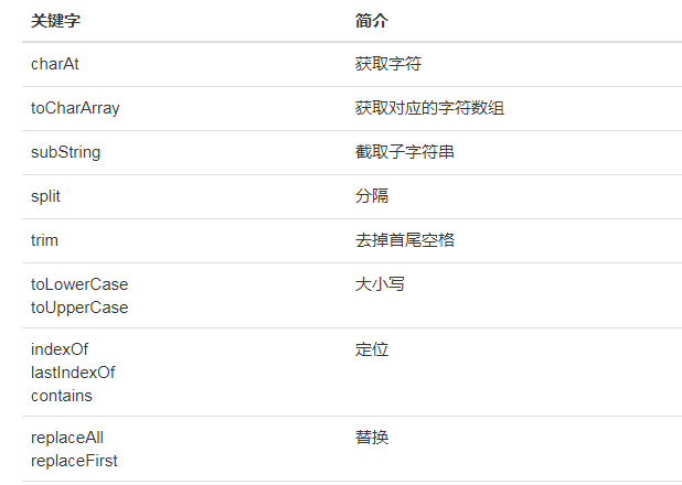 charAt(int index)获取指定位置的字符;toCharArray()是将字符串转换为对应的字符数组;subString 截取子字符串;split 根据分隔符进行分隔生成字符串数组;trim 去掉首尾空格后返回新的字符串;toLowerCase 返回全部变成小写 ,toUpperCase 返回全部变成大写的字符串;indexOf 判断字符或者子字符串出现的位置;contains 是否包含子字符串;replaceAll 替换所有的 ,replaceFirst 只替换第一个;