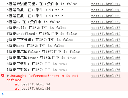 (function(){var a,b=-1,c=1,d=0,e=null,f=undefined,g='',h=NaN,i = false,j=true,k=[],l={};if (a) {console.log("a值是未赋值变量,在IF条件中 is true");}else{console.log("a值是未赋值变量,在IF条件中 is false");}if (b) {console.log("b值是负数,在IF条件中 is true");}else{console.log("b值是负数,在IF条件中 is false");}if (c) {console.log("c值是正数,在IF条件中 is true");}else{console.log("c值是正数,在IF条件中 is false");}if (d) {console.log("d值是0,在IF条件中 is true");}else{console.log("d值是0,在IF条件中 is false");}if (e) {console.log("e值是null,在IF条件中 is true");}else{console.log("e值是null,在IF条件中 is false");}if (f) {console.log("f值是undefined,在IF条件中 is true");}else{console.log("f值是undefined,在IF条件中 is false");}if (g) {console.log("g值是空字符串,在IF条件中 is true");}else{console.log("g值是空字符串,在IF条件中 is false");}if (h) {console.log("h值是NaN,在IF条件中 is true");}else{console.log("h值是NaN,在IF条件中 is false");}if (i) {console.log("i值是布尔值false,在IF条件中 is true");}else{console.log("i值是布尔值false,在IF条件中 is false");}if (j) {console.log("j值是布尔值true,在IF条件中 is true");}else{console.log("j值是布尔值true,在IF条件中 is false");}if (k) {console.log("k值是空数组,在IF条件中 is true");}else{console.log("k值是空数组,在IF条件中 is false");}if (l) {console.log("l值是空对象,在IF条件中 is true");}else{console.log("l值是空对象,在IF条件中 is false");}if (m) {console.log("未声明的变量,在IF条件中 is true");}else{console.log("未声明的变量,在IF条件中 is false");}})();