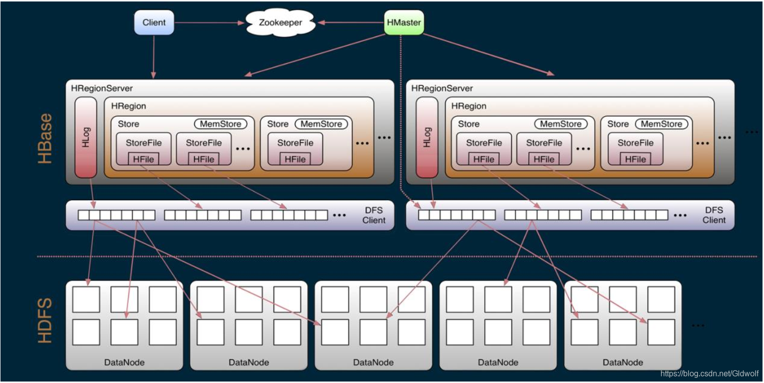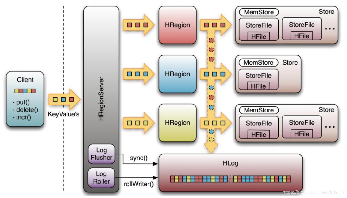 - HRegion 虽然是负载均衡的最小单元,但并不是物理存储的最小单元。事实上,HRegion 是由一个或多个 Store 组成,每个 Store 保存一个 Column Family。每个 Store 又由一个 MemStore 和 0 到多个 StoreFile 组成