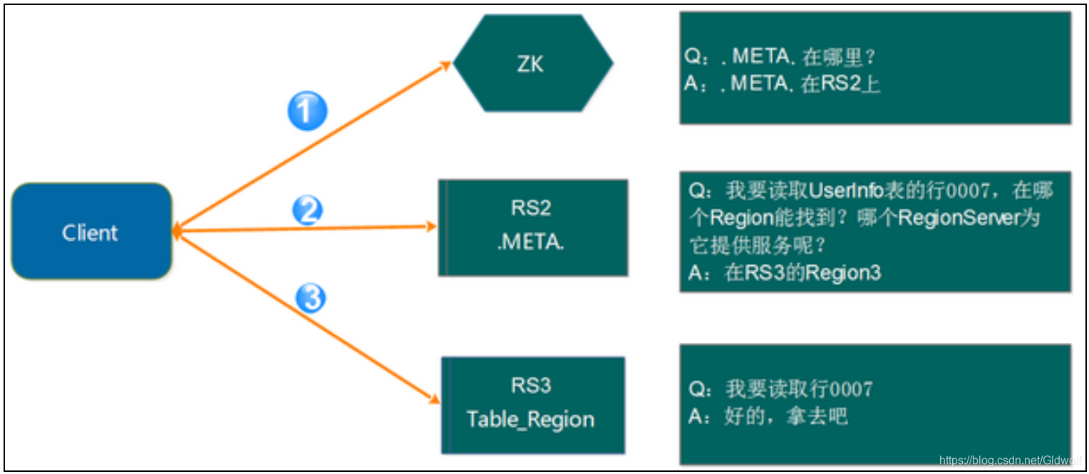 - Client 请求 ZooKeeper 获取 .META. 所在的 RegionServer 的地址