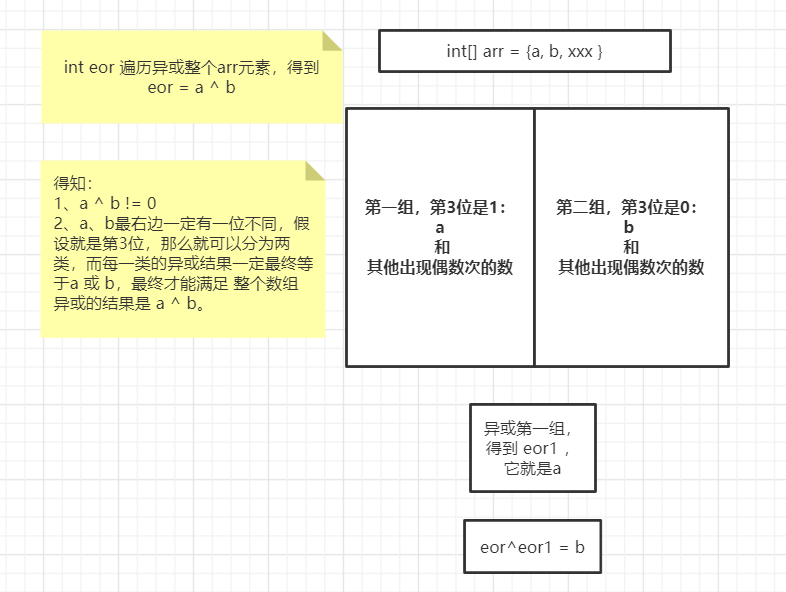 而由于整个数组异或的结果是 a ^ b ,整个数组又可以分为以 a 和 b 为代表的第3位是1的数、第3位是0的数 两类数,那么在各自的一类中,除了a 、b 之外,其他数一定是出现偶数次。那么就可以是以“第3位 是1的数”为条件,将数组重新异或一遍得到 eor1,假设 a 就属于 “第3位是1的数”这一类,那么eor1 = a,最后,eor ^ eor1 = b。