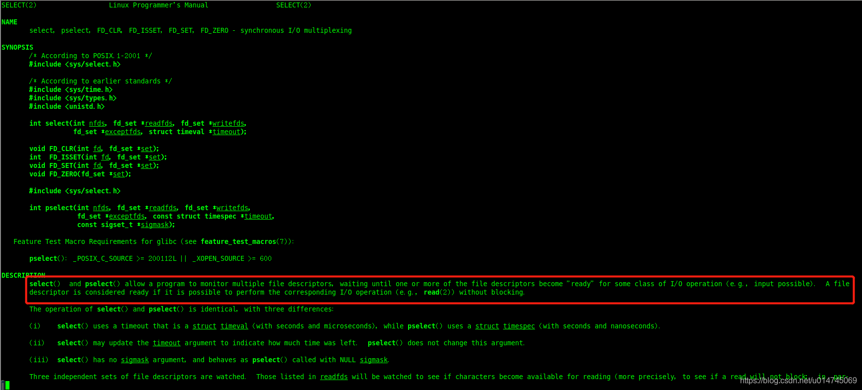 随着内核的发展,1983年加入了新的系统调用——select,它也是“多路复用”技术实现的第一个版本。使用 man 2 select 命令查看相关信息: