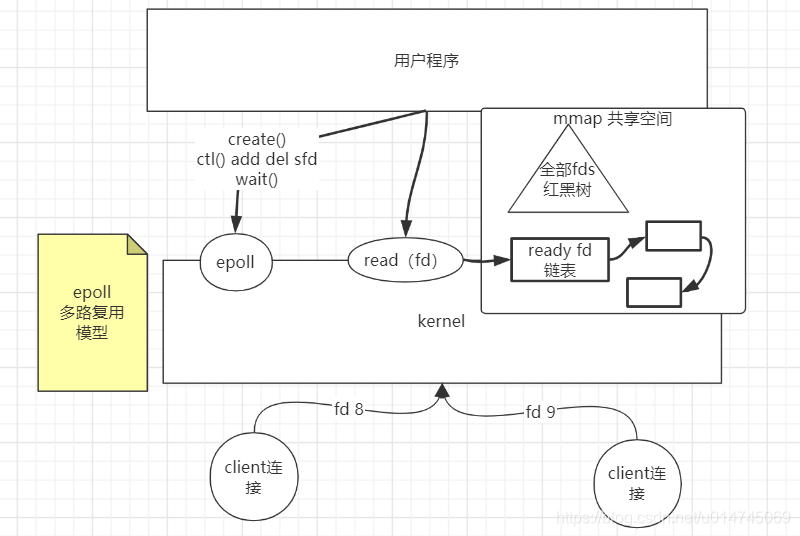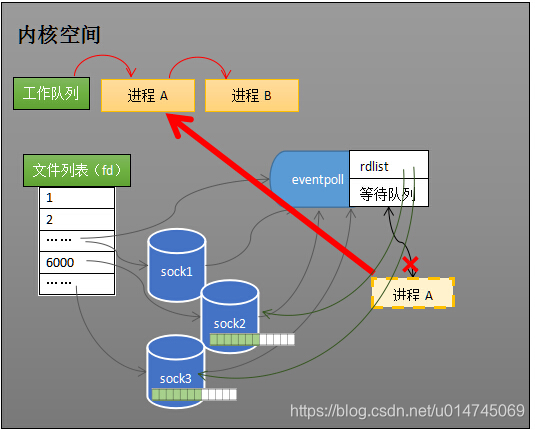 当socket接收到数据,中断程序一方面修改 rdlist,另一方面唤醒 eventpoll 等待队列中的进程,进程A再次进入运行状态。也因为 rdlist 的存在,进程A可以知道哪些 socket 发生了变化。