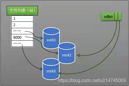 select 低效的另一个原因是程序不知道哪些 socket 收到数据,只能一个一个遍历。加入内核维护一个“就绪列表” ,引用收到数据的 socket,就能避免遍历:
