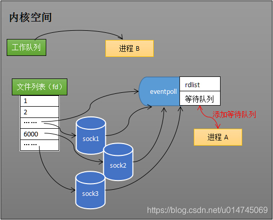 假如能够预先传入一个 socket 列表,如果列表中的 socket 都没有数据,挂起进程(阻塞),直到有一个socket 收到数据,唤醒进程。这种方法很直接,也是 select 的设计思想。操作系统把进程A分别加入多个socket的等待队列中,如下图: