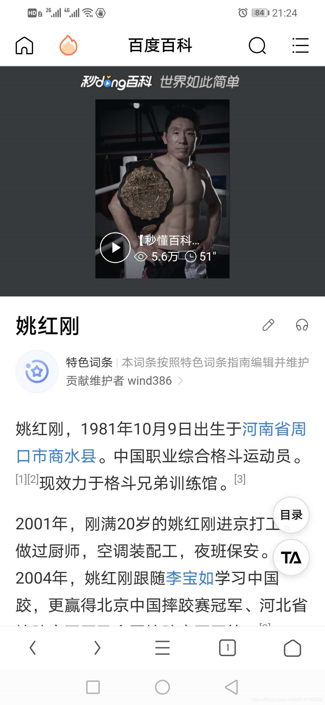 12月,我在新家附近找到了一家拳击训练馆(格斗兄弟训练馆),6千包了半年的大课,包括泰拳、自由搏击、拳击等课程可以自由学习,后来才发现,这个格斗兄弟训练馆是姚红刚开的,如果你不知道姚红刚是谁,可以去百度一下,这里贴一张他的词条截图: