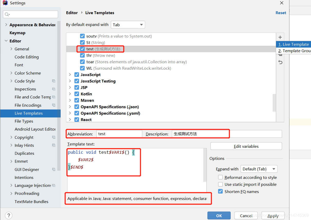 idea 的模板设置都在 Settings --> Live Templates 和 General-->Postfix Completion 中。
