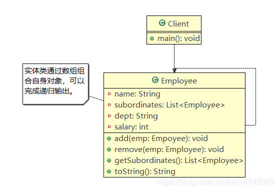import java.util.List;public class Employee {private String name;private String dept;private int salary;/** 通过数组组合自身对象*/private List<Employee> subordinates;public Employee(String name, String dept, int salary) {this.name = name;this.dept = dept;this.salary = salary;this.subordinates = new ArrayList<>();}public void add(Employee emp) {this.subordinates.add(emp);}public void remove(Employee emp) {this.subordinates.remove(emp);}public List<Employee> getSubordinates() {return subordinates;}@Overridepublic String toString() {return "{\"name\":\"" + name + "\", \"dept\":\"" + dept + "\", \"salary\":\"" + salary + "\", \"subordinates\":"+ subordinates + "}";}