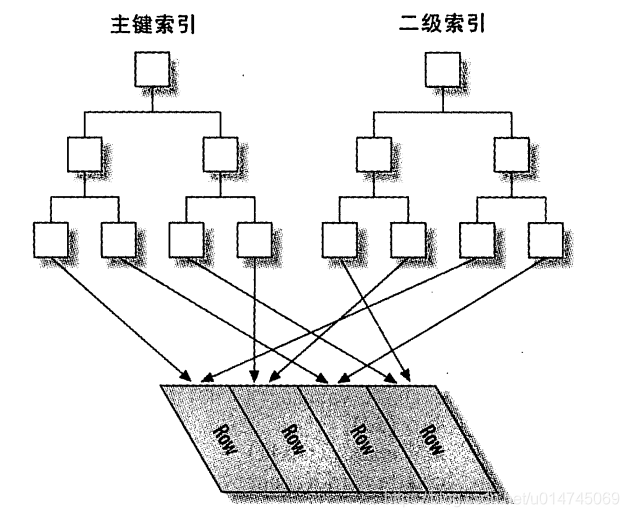 首先,不论在InnoDB还是在MyISAM中,索引都是以B树的形式来存储的,这没什么好说的(参考《MySQL 高级 —— 索引实现的思考》),然后我们看到,主键索引树中的叶子节点都会指向具体的数据行。