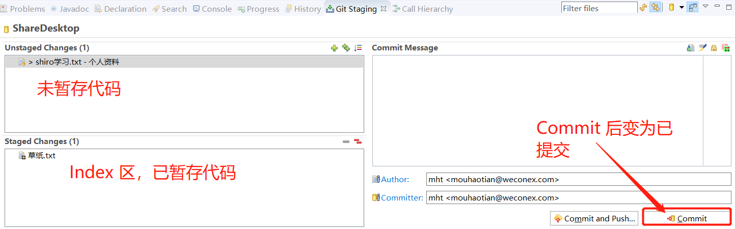 针对图形化的界面,如 Eclipse 中的 Git 插件,我们可以看到这样的区域: