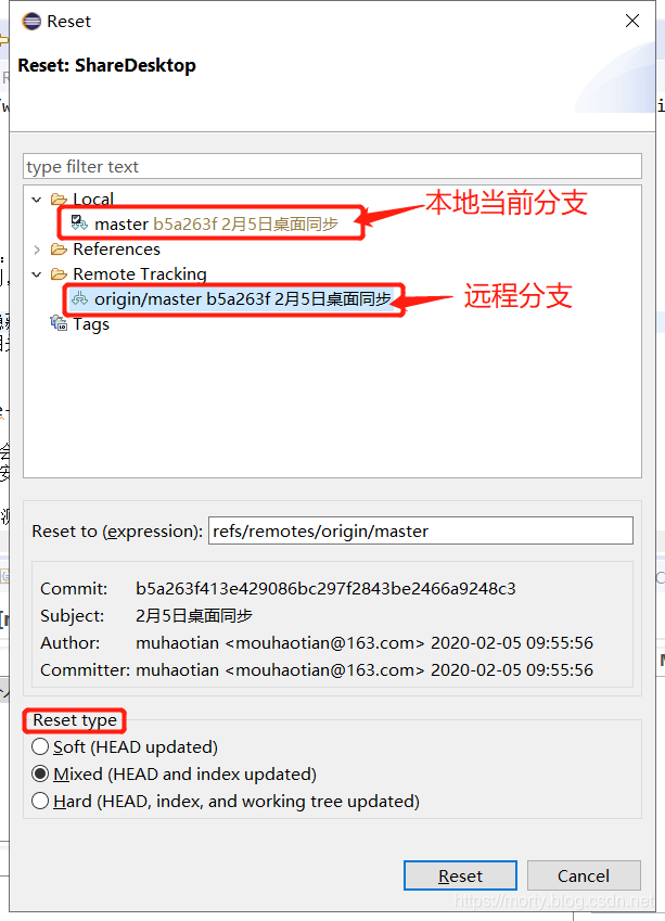 当我们打开 Reset 对话框,可以看到我们需要选择的参考系,我们此时可以选择远程分支的最新提交点作为 reset 的参考系,在选择 Reset type 的时候,有三种选项: