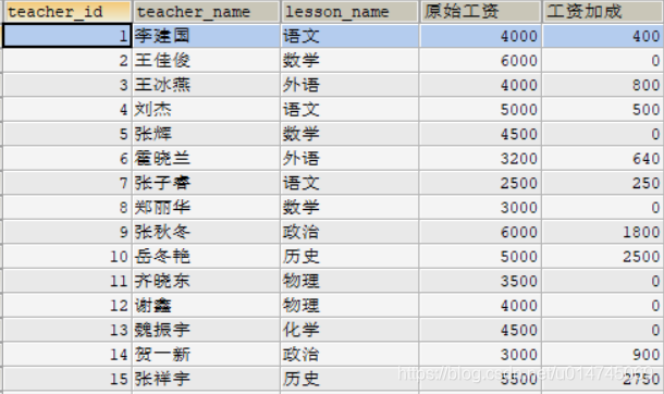 SELECT t.`teacher_id`, t.`teacher_name`, l.`lesson_name`,t.salary 原始工资,IFNULL(CASE l.`lesson_name` WHEN '语文' THEN salary * 0.1 WHEN '外语' THEN salary * 0.2 WHEN '政治' THEN salary * 0.3 WHEN '历史' THEN salary * 0.5 WHEN '生物' THEN salary * 0.3 END, 0.0) 工资加成