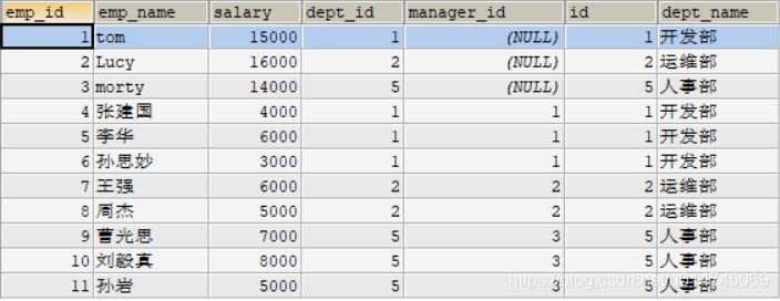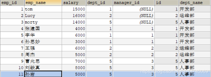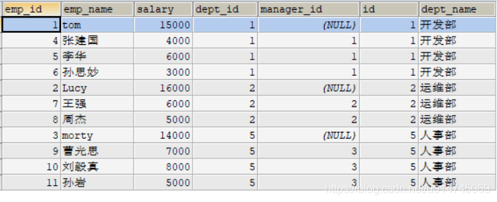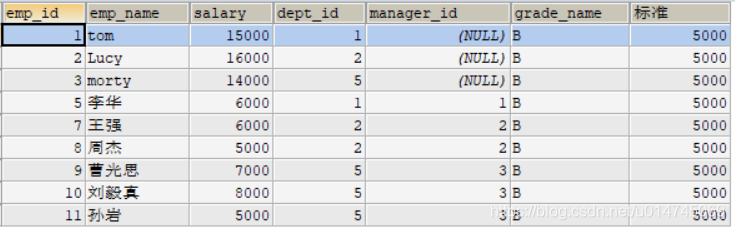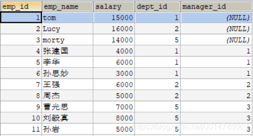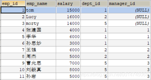 其中 ,manager_id 代表上级领导的 emp_id ,查询员工及其上级领导的信息: