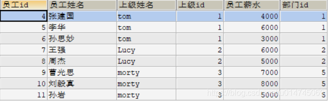 SELECT e.`emp_id` AS 员工id,e.`emp_name` AS 员工姓名,m.`emp_name` AS 上级姓名,m.`emp_id` AS 上级id,e.`salary` AS 员工薪水,e.`dept_id` AS 部门id