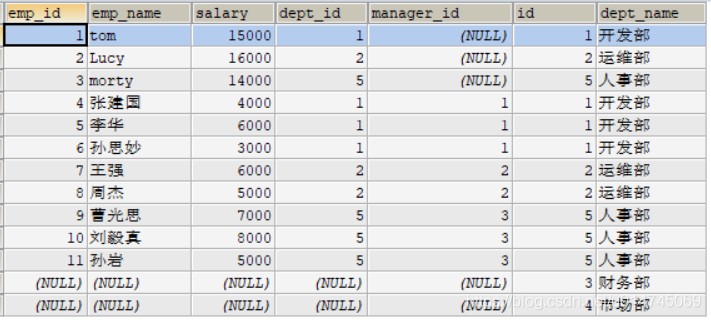 dept 作为主表自然也是全部查出,就连没有员工的两个部门:财务、市场部,也一并被查询出来。