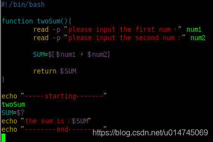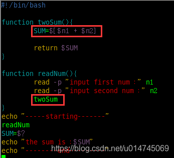 同样也是可以的,但是注意,变量名要保持一致。也就是说,在 Shell 脚本文件中,不论是在哪里定义的变量,只要还在这个脚本文件中,就可以直接访问。上图也看到,我们在 readNum 函数中通过控制台,读入了两个数字 n1 和 n2 ,直接在twoSum 函数体中使用也是可以的。另外, readNum 没有返回语句,默认也是最后一行语句执行的结果。
