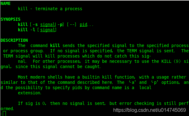我们来使用 man kill 来查看一下 kill 的使用手册: