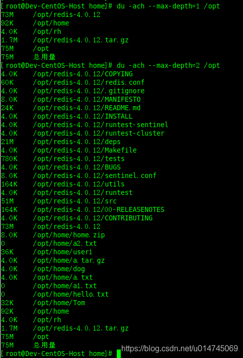 案例:查询 /opt 目录下的磁盘占用情况,深度为 1,再修改为深度为2