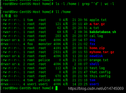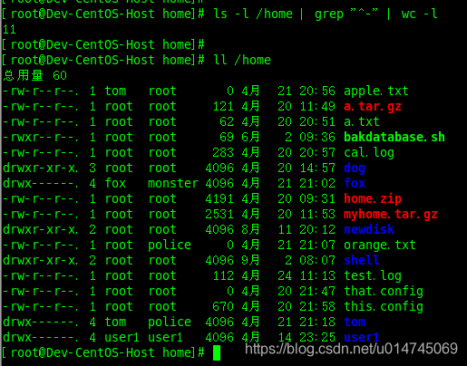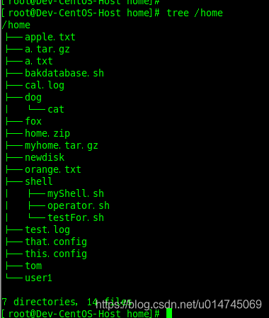 使用 tree 命令,显示 /home 目录下的树状结构,如果指令未找到,可以使用 yum install tree 进行安装(联网)。