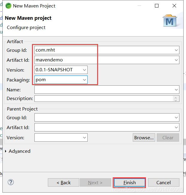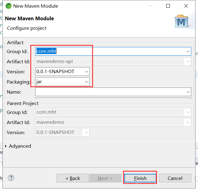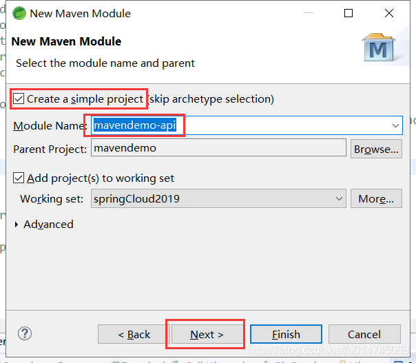 右键刚刚建好的父工程 mavendemo,New——>Maven Module:勾选第一项“simple project”——>填写会话框: