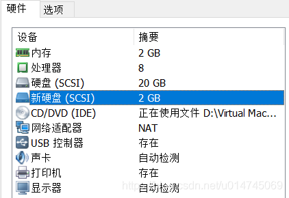 然后选择【SCSI(推荐)】—>【下一步】—>【创建新虚拟磁盘】—>【下一步】—> 磁盘大小改为 2 GB —>【下一步】——【磁盘文件默认】—>【完成】,在虚拟机硬件信息栏中看到“新硬盘”后,重启虚拟机,进行后续步骤。