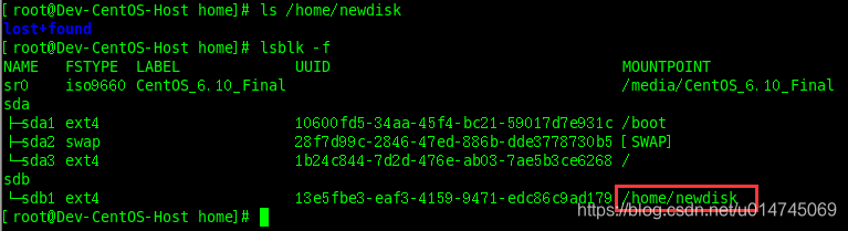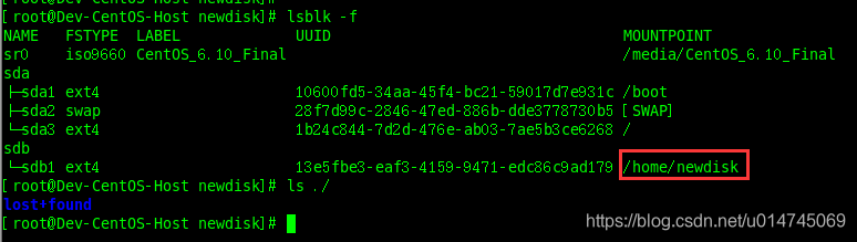 挂载后,再次查看分区情况,就可以看到挂载点为 /home/newdisk (挂载后,如果所处当前挂载目录需要重新进入再 ls):