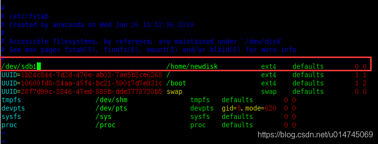 编辑 /etc/fstab 文件,加入红框内信息,保存并退出。