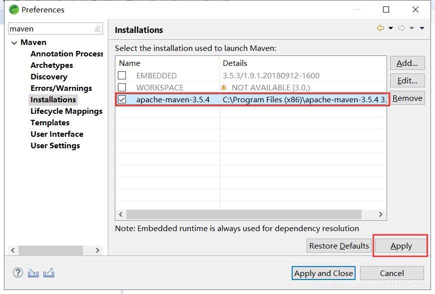 1、打开 Window 首选项,设置 Maven Installations: