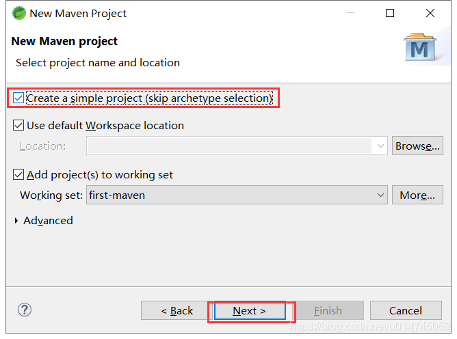 注意:在下图中,必须勾选 "Create a simple project (skip archetype selection)" 复选框,否则将无法生成理想的 Maven 项目结构。