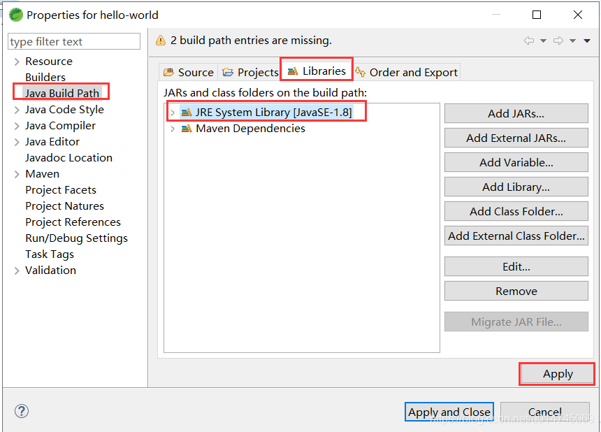 在创建完 Maven Java Project 之后,可能会遇到这样的问题。刚刚创建的项目中的 JRE System Library 是 JavaSE-1.7 或者 更低。