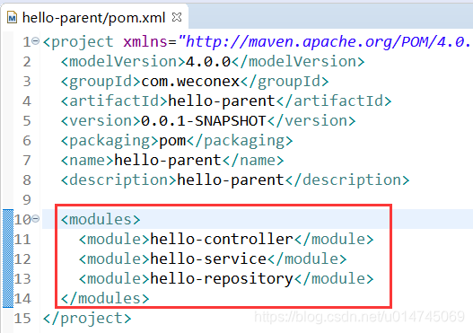 操作非常简单,只需要在 pom 文件中加入<modules>标签项即可,如下图所示: