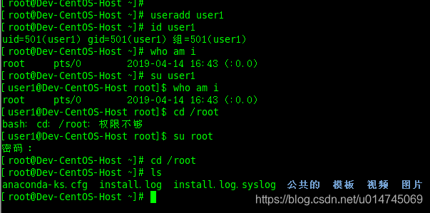 上图首先 使用 useradd 命令创建一个用户,然后 id 命令简单查看一下用户的分组和id信息,使用 su命令切换到 user1 用户,这时可以看到命令行行首已经由root 变为了 user1 。但是执行 who am i 依然是原来的root 用户。 使用 cd 命令切换到root目录,因为当前用户已经切换成了user1 ,所以权限不够。再切换回root用户,此时需要输入密码。切换回root用户之后,再进入root目录,可以成功访问。