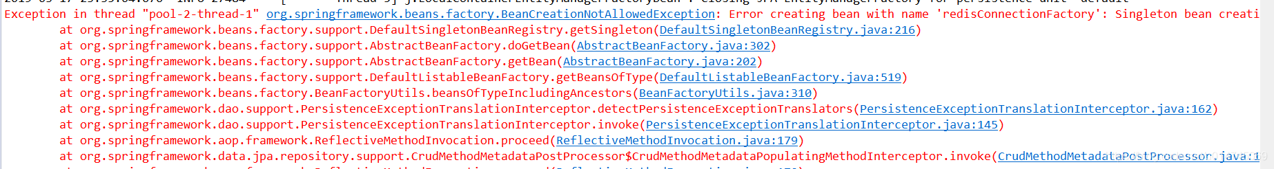 Exception in thread "pool-2-thread-1" org.springframework.beans.factory.BeanCreationNotAllowedException: Error creating bean with name 'redisConnectionFactory': Singleton bean creation not allowed while singletons of this factory are in destruction (Do not request a bean from a BeanFactory in a destroy method implementation!)
