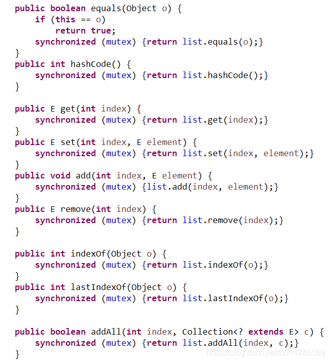 Collections是一个容器工具类,通过类似synchronizedList(List<T> list)、synchronizedMap(Map<K,V> m)等命名形式的静态方法,可以返回一个加了锁的对应容器。实际上,通过这种方式获得的同步容器仅仅是将普通的非线程安全的容器的方法进行synchronized封装: