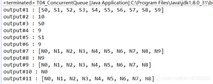 public static void main(String[] args) {Queue<String> strs = new ConcurrentLinkedQueue<>();Deque<String> names = new ConcurrentLinkedDeque<>();for (int i = 0; i < 10; i++) {strs.offer("S" + i); // addnames.offer("N" + i);}System.out.println("output#1 : " + strs);System.out.println("output#2 : " + strs.size());System.out.println("output#3 : " + strs.poll()); // FIFO,容器中的删除System.out.println("output#4 : " + strs.size());System.out.println("output#5 : " + strs.peek()); // 取出,容器中的不删System.out.println("output#6 : " + strs.size());System.out.println("output#7 : " + names);System.out.println("output#8 : " + names.pollLast()); // LIFOSystem.out.println("output#9 : " + names);System.out.println("output#10 : " + names.peekFirst()); // FIFOSystem.out.println("output#11 : " + names);}