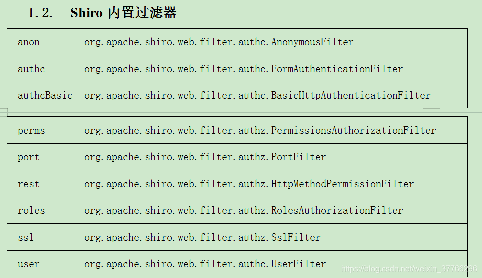 - 认证过滤器:anon(不认证也可以访问),authcBasic, authc(必须认证后才可访问)