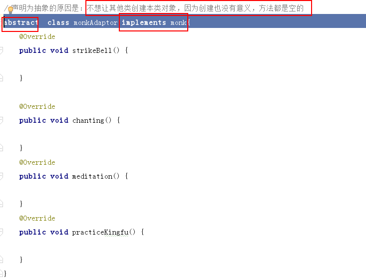 2. 适配器类需要定义成抽象的,因为创建该类对象,调用空方法是没有意义的